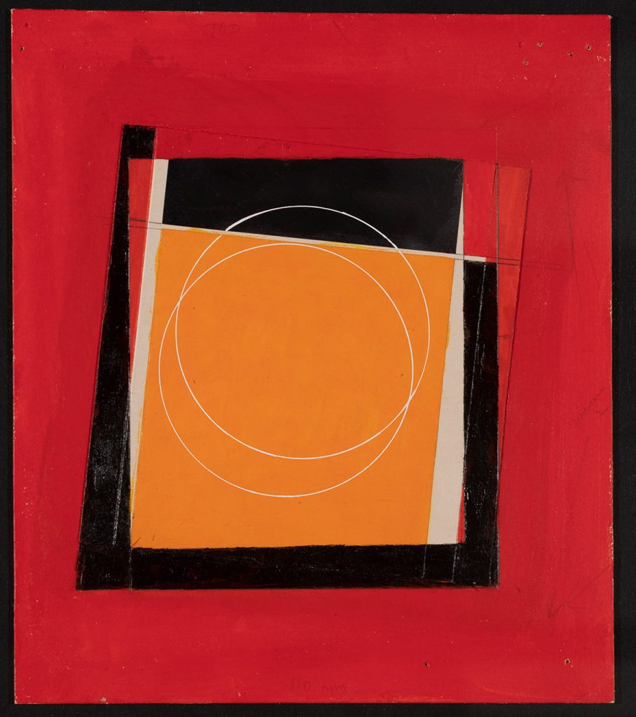 The Fitzroy weekend exhibitions culminated in critic Lawrence Alloway’s landmark book Nine Abstract Artists of 1954. Alloway detected an aesthetic fault-line within the nine, between the Purists and Concretists on the one hand and the softer St Ivesian landscape tendency on the other. Dannatt swung both ways. The hard logic of mathematics certainly appealed less to George than the more human realm of nature, landscape and music. Dannatt did, however, persevere with the beauties of geometry as we see here with White Circles with a Red Complex (1995), Linear Inversion Ochre (1976), Linear Form with Blue Circle (1998), Fanfare (1974) and the double sided Vaporetto (1977). Collage undoubtedly appealed to George with its rich, mostly local, cultural references. In A Swiss Collage (1985) and Milano (1977) Dannatt paid homage to Kurt Schwitters or Max Bill, works that use the Merz master’s lettering or else transform found posters into expressive papieres déchirés.