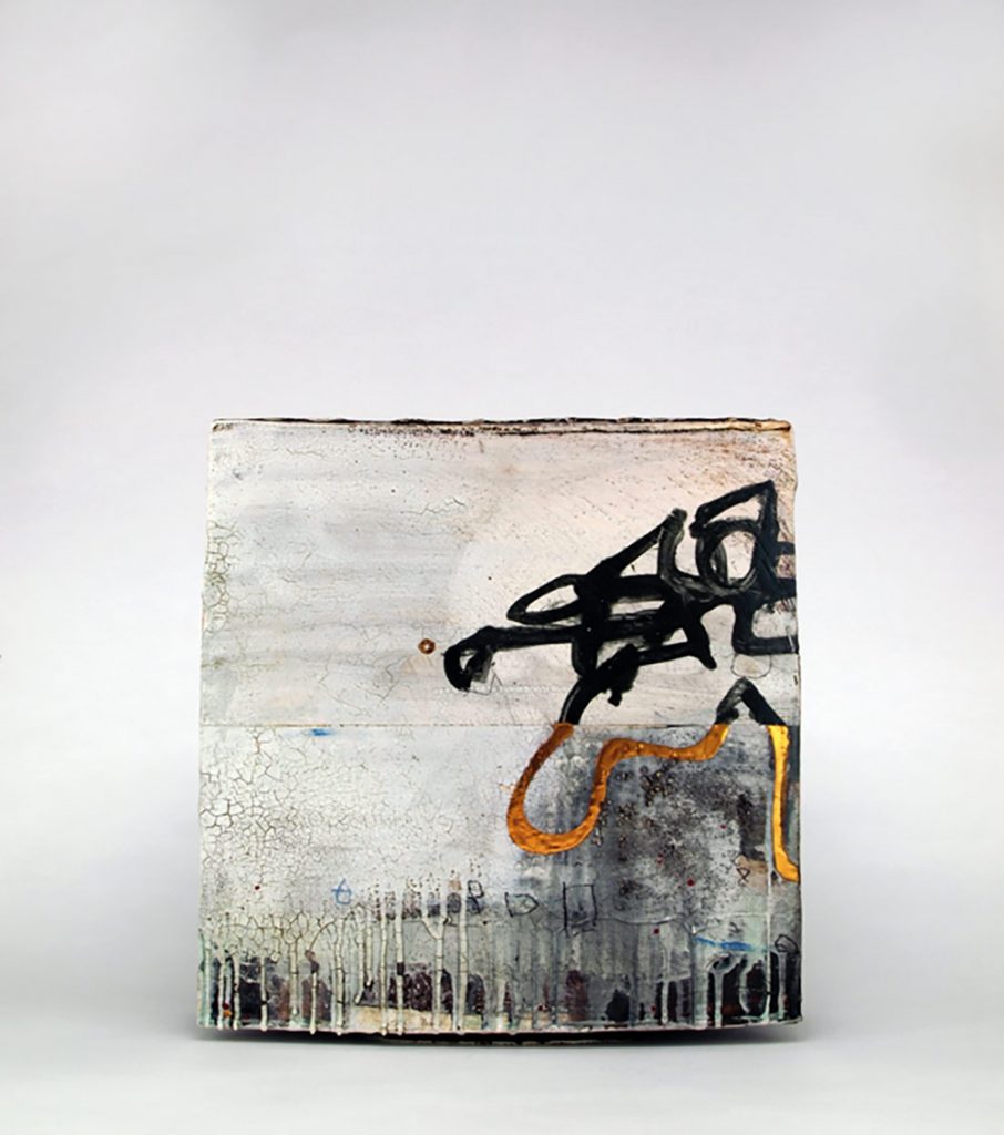 “On the wall in St Ives based potter, Sam Hall’s studio is a single word, scored into the dust-covered plaster. ‘Fight’ it says. It strikes me as a call to arms, an imperative note to self that though life might be a struggle, success can be achieved through a willingness to engage and do battle..a glance at one of Hall’s pots, a work in progress on the floor, reveals another lone word. ‘Tune’ has been etched onto one side of the form which resembles a truncated crushed cylinder, but again, its appearance is inexplicable. ‘I don’t know why I wrote it’ says Hall. The Yorkshire born potter is not being difficult or evasive. His work, which is celebrated internationally, often makes use of random words whose origin is hall’s subconscious but whose meaning is never static or fixed.”