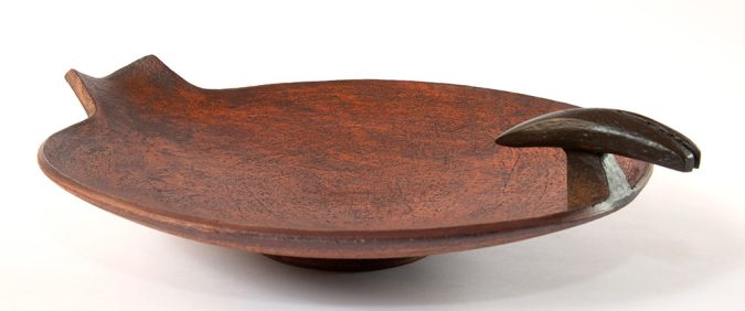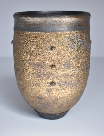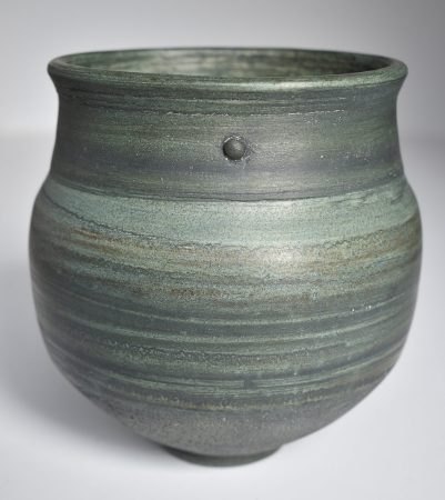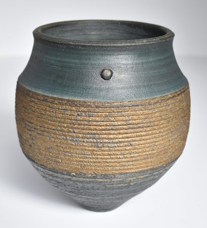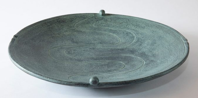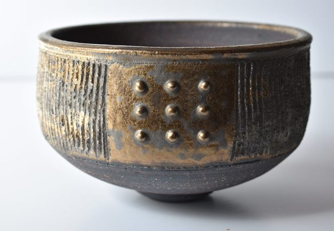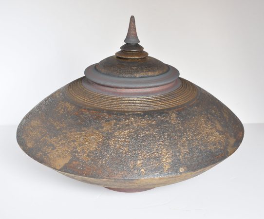 This new work also bears his characteristically and even ferociously taut outlines. There is a disciplined cutting-edge to the profiles, and a lean elegance of form. Sometimes a tensile, swervy line will cross the surface of a dish; or a tight geometric pattern will cover a surface. A stunning colour burst occasionally appears on a cover or finial or circular spot: like a fiery Mars. There are few extrovert moments in the work, and the overall mood is quiet and votive. A pot such as Studded Vessel is highly balanced: rectangular sections around the body are scored either vertically or marked by a disciplined group of nine small studs. These studs are applied more prominently, even aggressively, to the edge of one of his temple top vessels which allude to Tibetan or Chinese architecture.