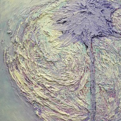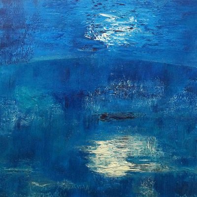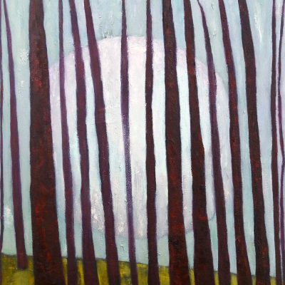 Fractured contains two of the three key symbolic elements used in this collection of paintings: the haven or shelter, and tree-like structures. In Constant, Silent the density of these foregrounded tree-like structures almost completely masks the third symbolic element in these paintings – the Moon. For Fullalove, the Moon is a symbol of life and balance. In conversation, Fullalove acknowledges the crepuscular landscapes of Samuel Palmer (1805-1881) as another influence, particularly the artist’s balancing of shadow and light. This duality and other Romantic imagery associated with the Moon such as melancholy, loneliness, love, and inconstancy are also evident in readings of the paintings if we so choose. However, watching Fullalove become animated when discussing how the very size of the moon – much larger in ratio to the Earth than any other satellite in the solar system – is what may make life possible, it is clear that it is actually the physical effect these celestial objects have on one another and the delicate orbital balance they are in, that is uppermost in the artist’s mind. In the paintings, the balance between the Moon and the Earth can also be taken to represent that between humanity and nature, and between people. Knowing the inner strength Fullalove derives from the Moon and his symbolic use of trees a painting such as A Constant Within is as close to a self-portrait that we are likely to find in his work.