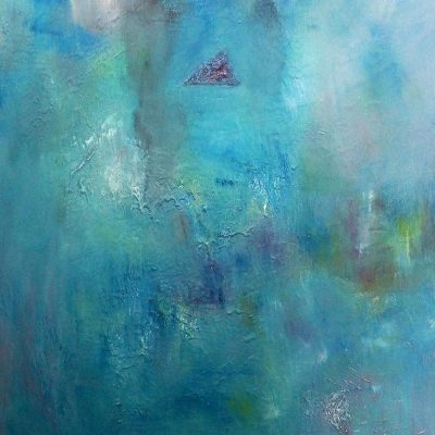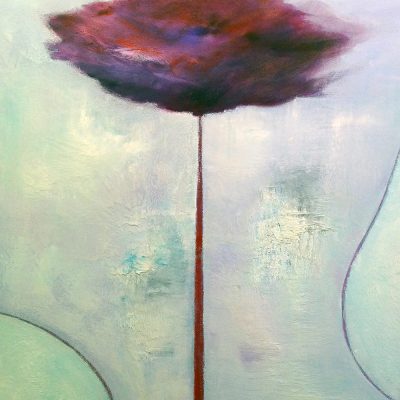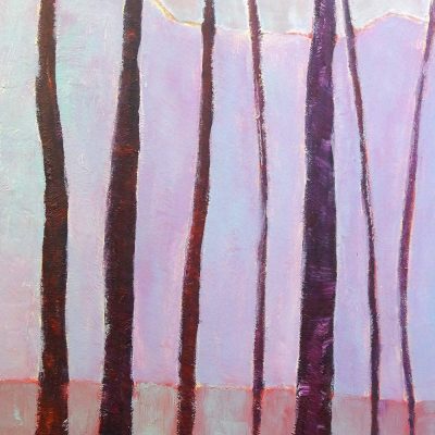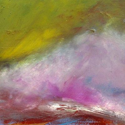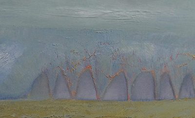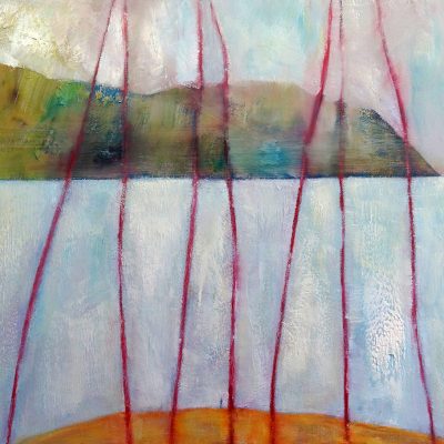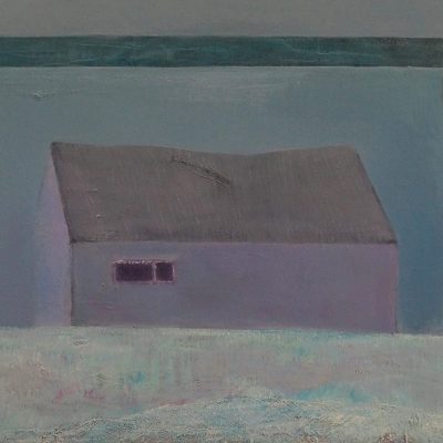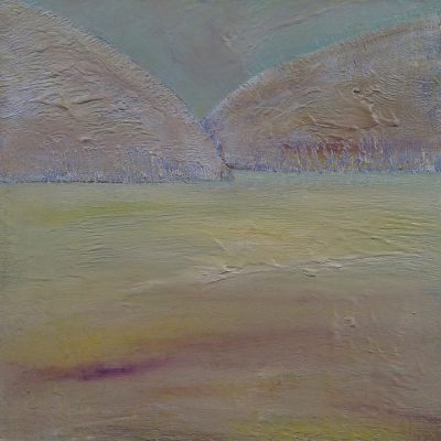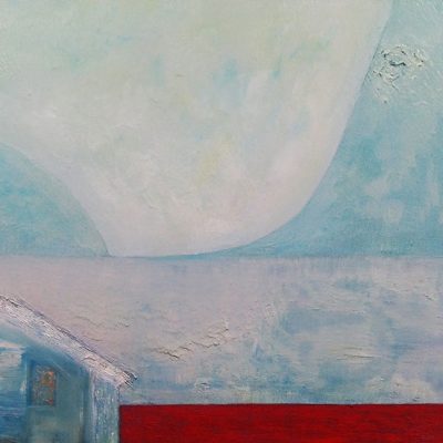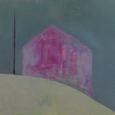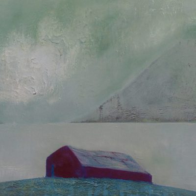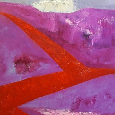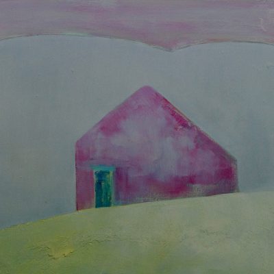 In Fullalove’s paintings, the presence or absence of people is always implied. Our presence as invited viewers in these landscapes is a given. In addition, isolated buildings offering shelter or haven suggest habitation, either past or present. As children, we have all drawn our house, most often with our family as more or less elaborate stick figures standing outside. It is a metaphor for safety, unconditional love, and a relative sense of permanence. In the series of paintings that includes From a Silent Place, Partial Haven, Silent Place I-III, and A Sheltered Haven, the shelter or haven takes on many different meanings. We question its isolation, and whether it is inhabited or derelict. Is it a place of seclusion and escape, or a place of refuge having been cast out? Is the land slowly reclaiming it, subsuming it to become yet another geological layer of the history of the landscape? The seeming permanence of stone and the security of ‘dwelling within’ are cast adrift. Time may pass slowly in these paintings, but it is always in a state of flux just as our lives are. This sense of passing time is reflected in the surface flatness of Silent Place I-III. The unexpected transparent pinkness of the building gives it a vaporous impermanent, almost eerie quality. In Landscape in Red a similarly ghostly house topples into an abyss –perhaps the final resolution of Fractured.