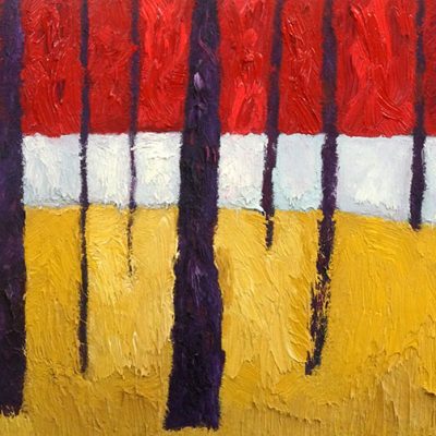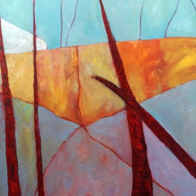 Following the creation of this body of work over the past year has been a fascinating experience. Whilst some paintings, such as the exuberant Red Raw, have remained unchanged, for others the transformation has been quite radical. In the latter instances, the actual composition of the painting has not been altered, it is the colour palette that has changed. This reconsideration of the tonal qualities of a painting results not only in the emotional charge of the work changing but, in certain cases, the visual reading of the painting itself. The first version of Fractured was dominated by bold autumnal colours, a building standing resolute within a heavily accented landscape by the barren tree-like structures stretching beyond our field of vision. In the final version of the painting, the reworking of the outer two divisions of the landscape to a predominantly blue tone creates a visual extension of the sky downwards. Rather than an autumnal landscape, the painting now takes on a far more dramatic tone. One which depicts the ghostly resonance of a house edging ever closer to a disastrous tipping point, precariously balanced on a rock which is itself delicately balanced on another. The viewer’s eye-line is drawn both to the fulcrum at the centre of the painting, and the leftward leaning rock on which the house is balanced. The lightening of the tonal qualities of the painting’s internal drama is offset by increasing the red saturated hues of the tree-like structures. In the final version, the bold upwards right to left arc of a ‘tree’ accentuates the perceived imbalance of the rock, its movement to the left, and its implied final cataclysmic fall.