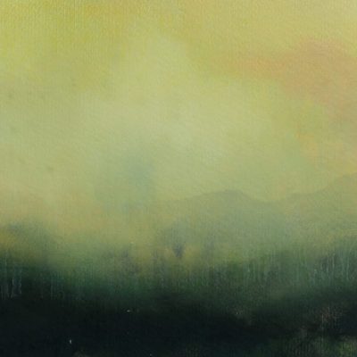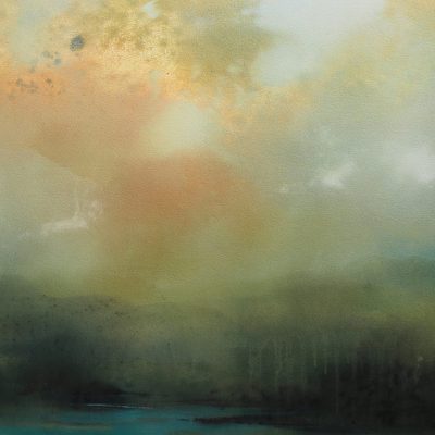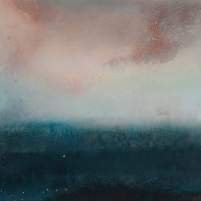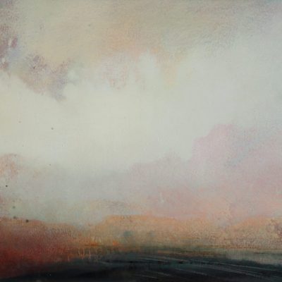 ‘Bundalloch’, in Scotland, is a work that conveys an atmosphere of dank stillness and silence, suggesting an air of expectation. The fluidity of the technique matches the ever-changing light and clouds of a heavy day. Another work produced in Scotland, ‘Hourn’, is focused on a dramatic, threatening sky that fully occupies two-thirds of the paper. With minimal reference to other landscape elements, the bold palette of dark colours invites a range of interpretations. The implied threat is compelling and haunting.