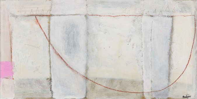 In a recent discussion, Hodges spoke of her recurrent use of certain motifs and phrases, comparing them to those of Beethoven and Bach, and referring to the latter’s tight compositional structures, to his inventions, and the way in which he composed a series of works, each in a different key. Such considerations are brought to bear in Hodges’ painting, in which, within her sensuous handling of materials, one notes finely calibrated shifts in pitch and tempo, and exclamatory flourishes of staccato line and colour set against passages of calm delicacy.